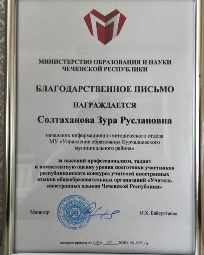 17.09.2020Ассаламу |алайкум! Хотим поздравить куратора нашей МБОУ «Илсхан-Юртовская СШ им.А.Н.Кадыровой» Солтаханову Зуру Руслановну с получением Благодарственного письма от Министерства Образования за высокий профессионализм, талант и компетентную оценку уровня подготовки участников республиканского конкурса учителей иностранных языков общеобразовательных организаций «Учитель иностранных языков ЧР». Дала т|аьхье беркате йойла!