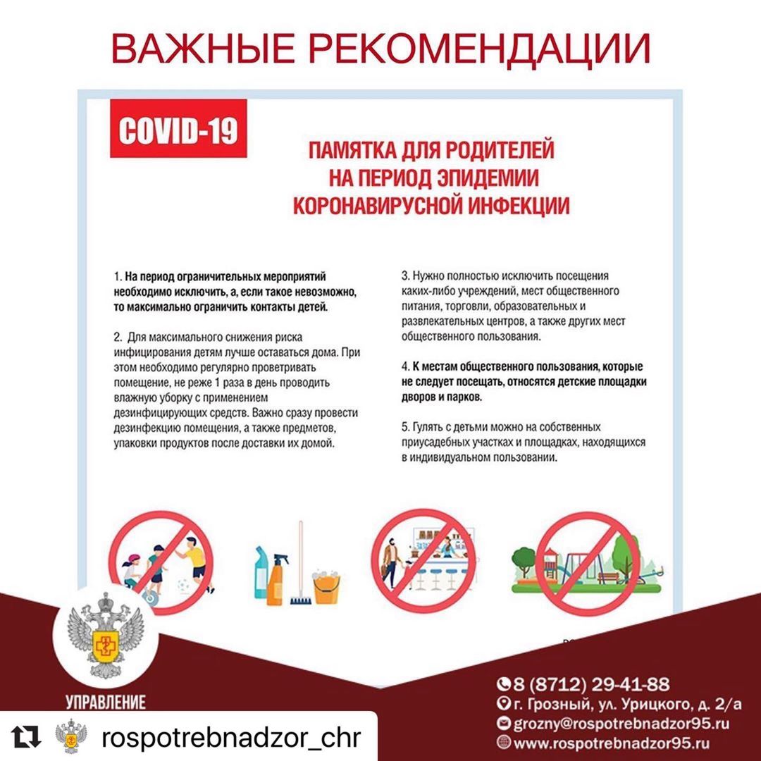 28.09.2020Традиционно осень — это время, когда заболеть особенно легко. Чтобы с наступлением холодов ребёнок не подхватил ОРВИ, Роспотребнадзор @rospotrebnadzor.official рекомендает соблюдать меры безопасности:⠀🔸 Сведите к минимуму контакты детей.🔸 Проветривайте помещение не реже 1 раза в день и проводите влажную уборку с применением дезинфицирующих средств.🔸 Не посещайте общественные места и детские площадки.🔸 Во время прогулок по паркам не подходите к другим взрослым и детям.🔸 Объясните ребёнку, что за пределами квартиры нельзя прикасаться руками к лицу и к каким-либо предметам: дверным ручкам, поручням и перилам, стенам, кнопкам лифта.🔸 Дезинфицируйте и мойте руки с мылом.⠀Берегите себя и своих близких!_____________________________Управление Роспотребнадзора по Чеченской Республике📲 горячая линия по COVID-19:8 (989) 916-72-348 (938) 989-07-58📍 ЧР, г. Грозный, ул. Урицкого, д. 2/а☎️/📠 8 (8712) 29-41-88✉️ grozny@rospotrebnadzor95.ru🌐 www.rospotrebnadzor95.ru