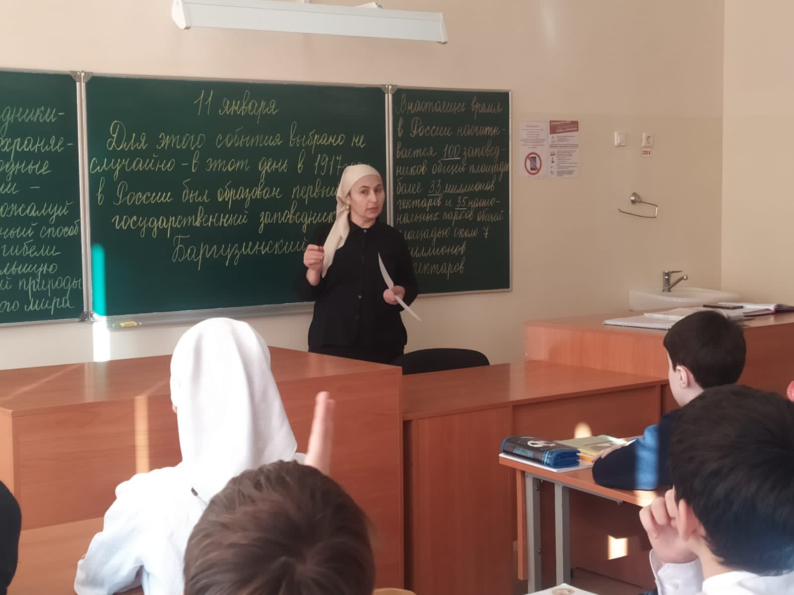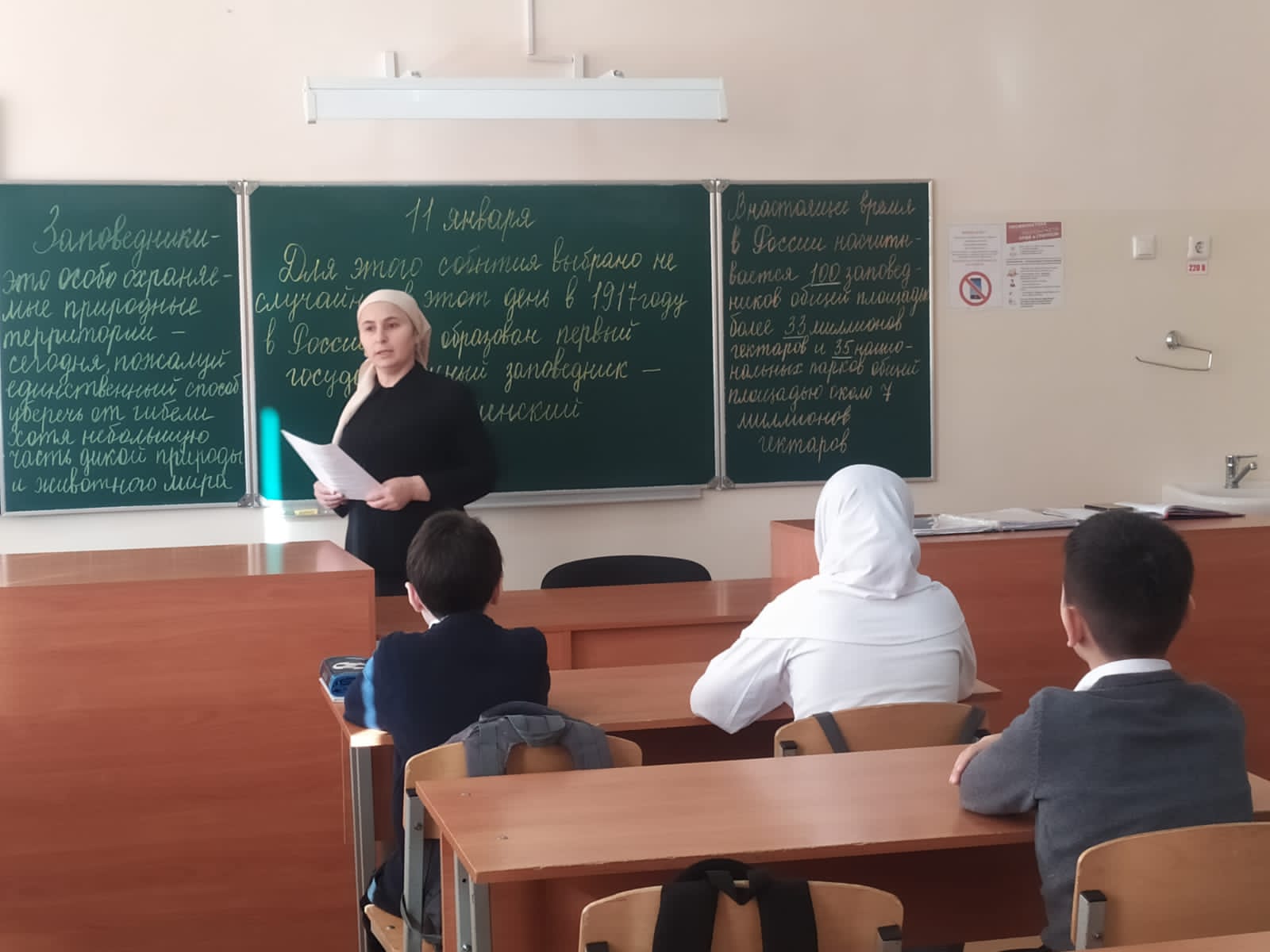 12.01.2023В целях эффективности реализации мероприятий федерального проекта «Успех каждого ребенка» Нацпроекта «Образование» в МБОУ «Илсхан-Юртовская СШ им.А.Н.Кадыровой» 12.01.23г были проведены классные часы ко Дню заповедников и национальных парков.