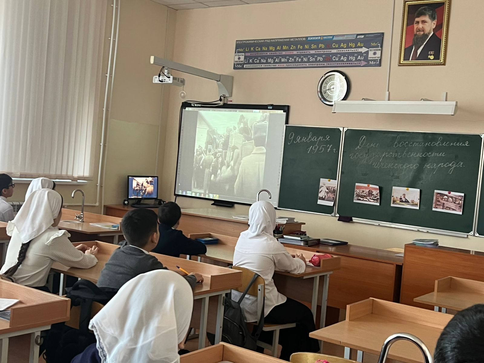 09.01.2023В целях эффективности реализации мероприятий федерального проекта «Успех каждого ребенка» Нацпроекта «Образование» в МБОУ « Илсхан-Юртовская СШ им.А.Н.Кадыровой» 09.01.23г были проведены классные часы ко Дню восстановления государственности в Чечне (1957).