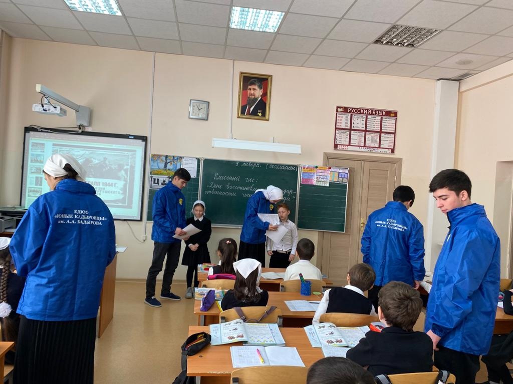 16.01.2023В целях эффективности реализации мероприятий федерального проекта «Успех каждого ребенка» Нацпроекта «Образование» в МБОУ « Илсхан-Юртовская СШ им.А.Н.Кадыровой» 09.01.23г были проведены классные часы ко Дню восстановления государственности в Чечне (1957).9 января Чеченская Республика отмечает очень важную в своей истории дату — День восстановления ЧИАССР. Осознавая значимость этого события для чеченского народа, Глава Чеченской Республики, Герой России Рамзан Ахматович Кадыров в 2010 году подписал Указ об объявлении 9 января Днем восстановления государственности.Начиная с 2010 года в этот день ежегодно во всех школах проходят праздничные мероприятия, цель которых воспитание у учащихся чувства патриотизма и привязанности к своим национальным корням, беззаветной любви к своей Родине, интереса к своей истории и стремления к познанию традиций и обычаев чеченского народа.В рамках мероприятий, посвященных этой праздничной дате были проведены тематические классные часы в 5-11-х классах на следующие темы: «Важные страницы нашей истории», «Живи и помни», » В феврале 1944 …» и т.д.В процесс также были вовлечены и школьные патриотические отряды «Юные Кадыровцы», которые провели беседу с учащимися начальных классов. Юные Кадыровцы познакомили учащихся с историей празднования Дня восстановления ЧИАССР, рассказали о тяжёлой и трудной жизни наших отцов и дедов в годы ссылки, провели акцию по раздаче буклетов «9 января — День восстановления ЧИАССР» учителям и учащимся школы. Стоит отметить, что буклеты, подготовленные усилиями самих ребят, получились очень информативными и заинтересовали каждого, кто их получил.«К большому сожалению, история чеченского народа богата трагедиями, и особое место в этой череде занимают сталинские репрессии и изгнание в Сибирь и Среднюю Азию. Сегодня, живя в мирном, процветающем регионе, мы не имеем права забывать о подвиге наших предков, чье бесстрашие и приверженность к своей национальной идентичности стали залогом нашего спокойного настоящего», — отметили «Юные Кадыровцы».