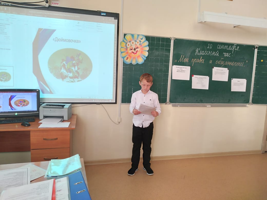 20.09.2023В целях эффективности реализации мероприятий федерального проекта “Успех каждого ребенка» Нацпроекта «Образование» в МБОУ «Илсхан-Юртовская СШ им.А.Н.Кадыровой» 20 сентября 2023 г в 2-4 классах прошли классные часы по теме "Права и обязанности школьника". Цель: формировать представления о правах и обязанностях школьника; показать единство прав и обязанностей; показать необходимость ограничения некоторых прав и свобод; способствовать формированию правовой грамотности и осознанному нравственному поведению; воспитывать ответственность за свое будущее; развивать логическое мышление и воображение.