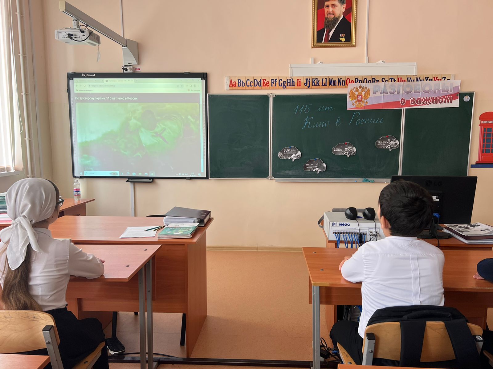 16.10.2023В понедельник, 16 октября 2023 года в 1-11 классах в МБОУ «Илсхан- Юртовская СШ имени Аймани Несиевны Кадыровой» после традиционной линейки, прошли классные часы «Разговоры о важном». Тема разговора: «По ту сторону экрана. 115 лет кино в России». Цель занятия: познакомить обучающихся с историей отечественного кинематографа, развивать интерес к профессиям, связанным c анимацией и киноиндустрией, способствовать осознанию младшими школьниками ценности кинематографа, анимации, как части отечественной культуры, воспитывать уважением к людям, внёсшим вклад в её становление.
