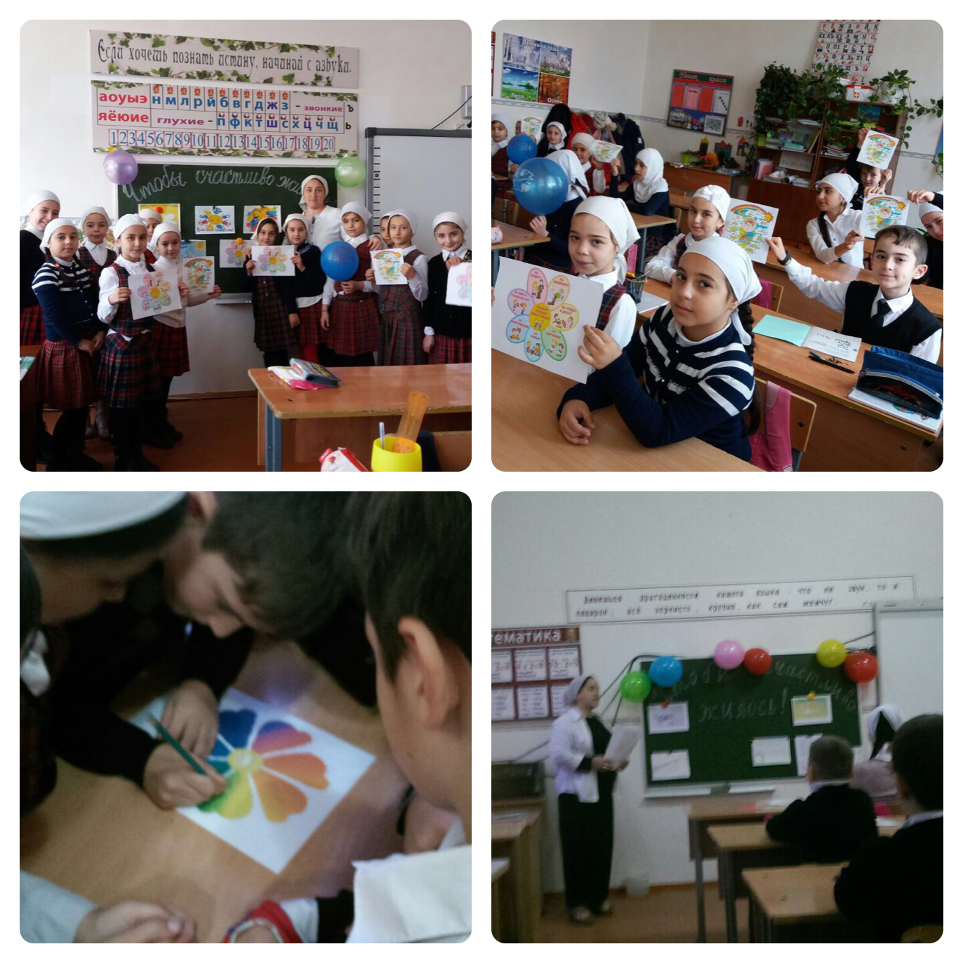 06.12.2017Классными руководителями Мицаевой Т.М., Микиевой Т.Ш-А., Хазбулатовой Я.Р.были проведены классные часы на тему «Чтобы счастливо жилось», с целью поддержать идею о том, что стремление к счастью является общим чувством для всех людей нашей планеты. Активны были все дети во время проведения классных часов, с восторгом и интересом приняли участие в конкурсах и играх.
